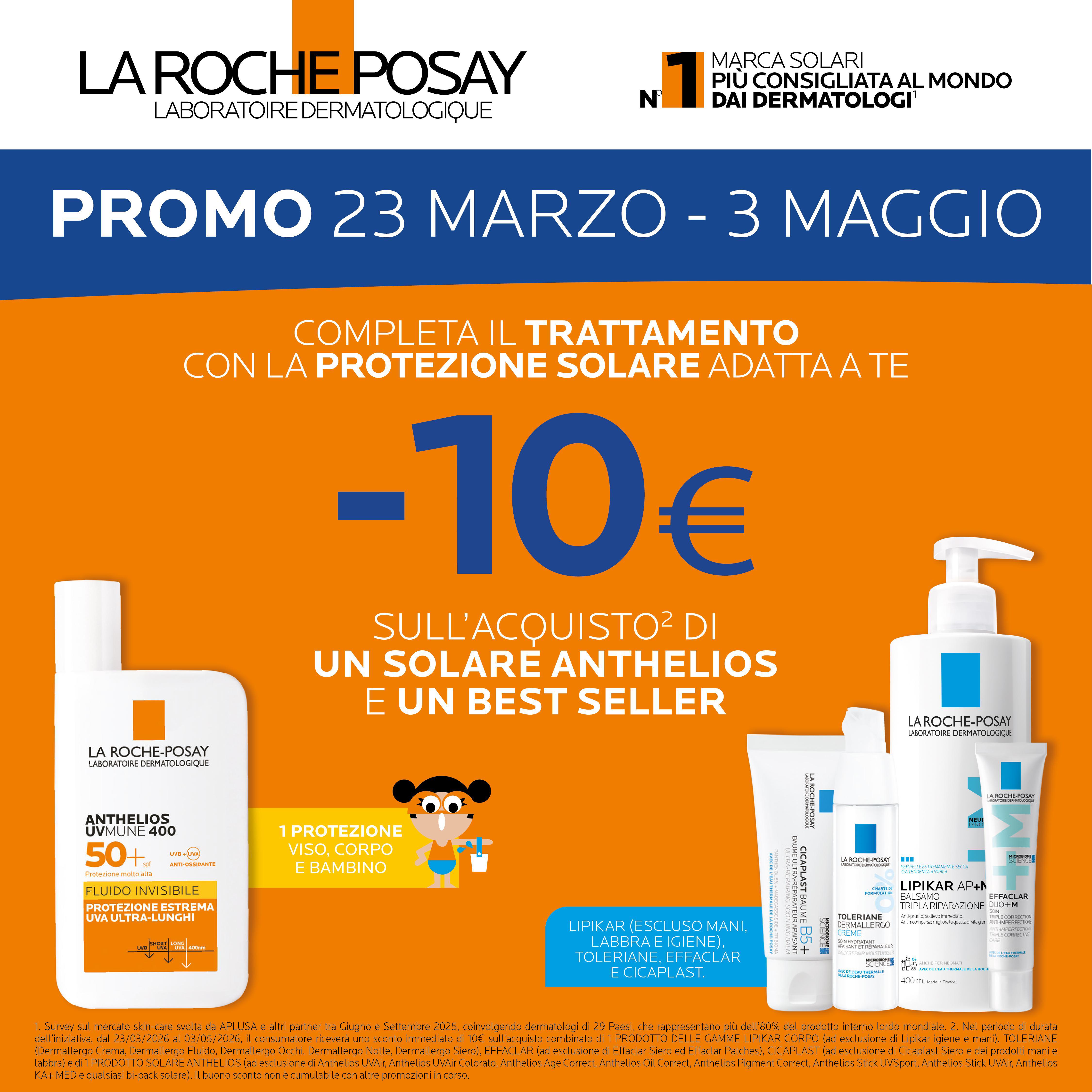 Lo sconto -10€ è valido sull’ acquisto combinato di 1 trattamento La Roche-Posay e di 1 solare Anthelios💙🧡